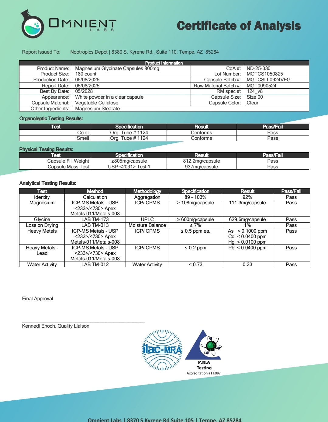 Vi bruker Magnesium Glycinate fra Nootropics Depot fordi de er kjent for høy kvalitet, renhet og grundig laboratorietesting, noe som sikrer et trygt og pålitelig produkt.